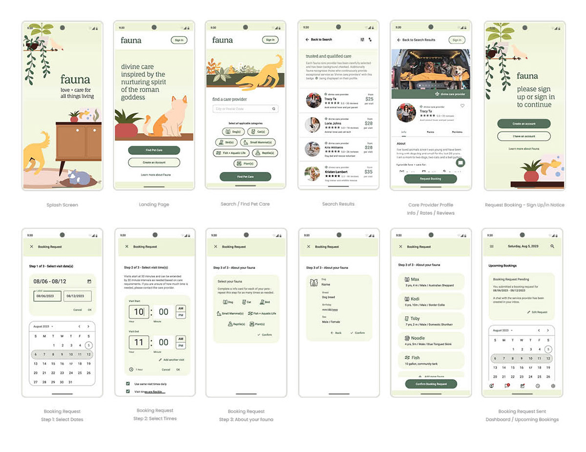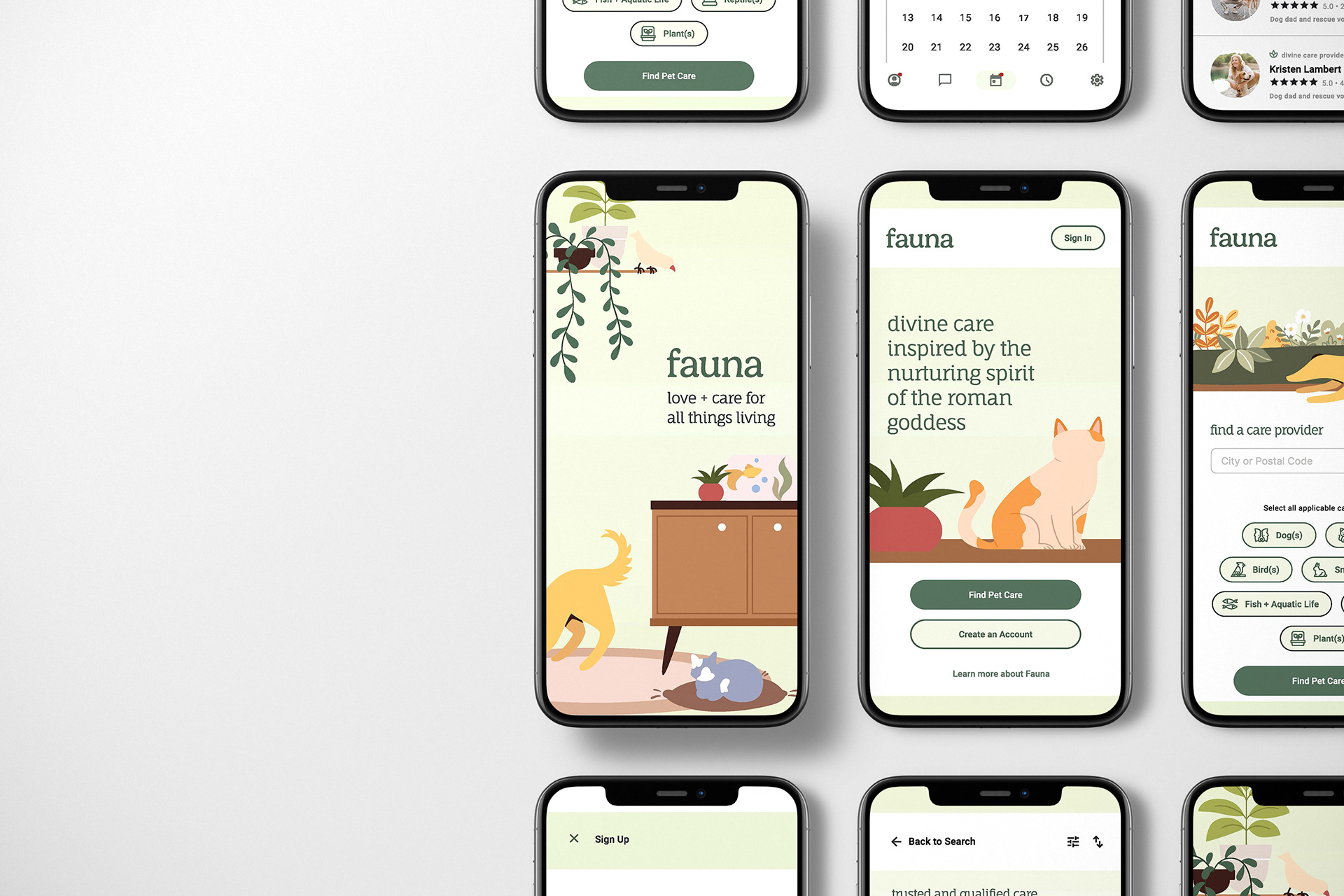 I created Fauna, a unique service app designed to connect users with qualified caregivers for in-home pet and plant care while they’re away. Unlike existing platforms that typically focus on cats and dogs, Fauna considers a broader range of pets, including fish, small mammals, birds, and reptiles, as well as both indoor and outdoor plants.