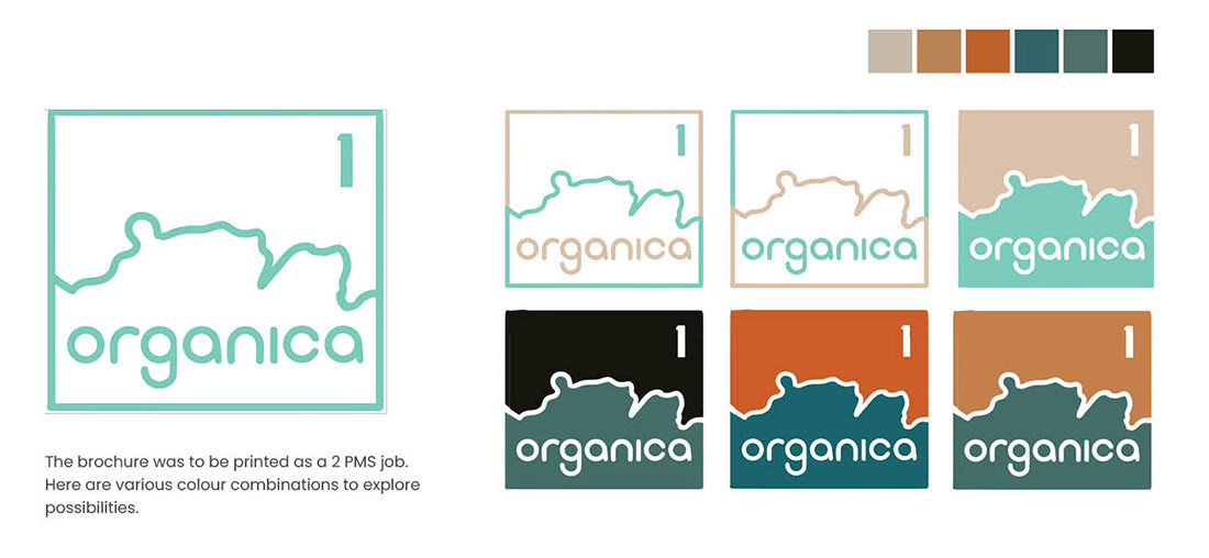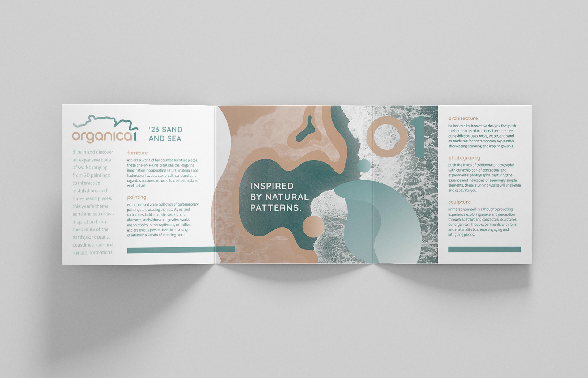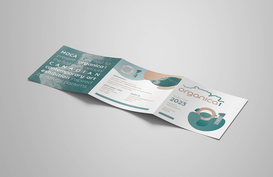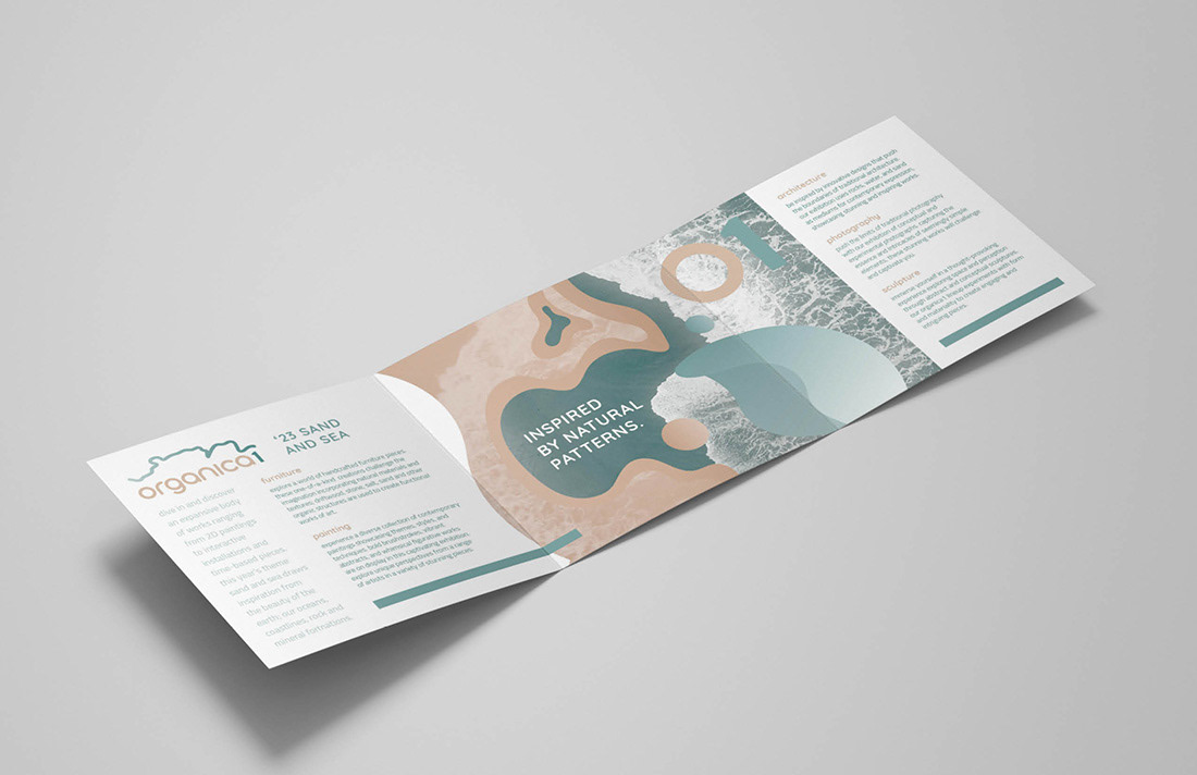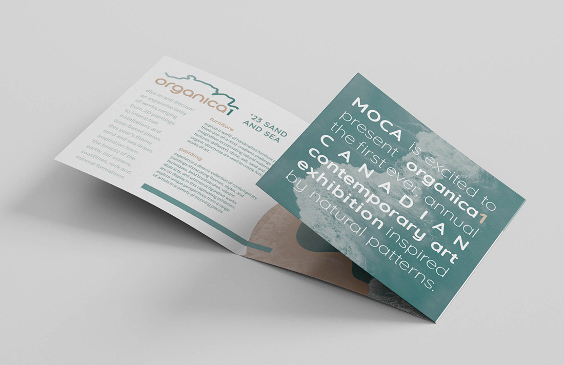 After creating the branded elements, we designed a two-color, square, three-panel brochure to promote the event. The brochure highlights Organica1, which showcased artwork spanning 2D pieces, installations, and time-based works (such as video) inspired by nature.